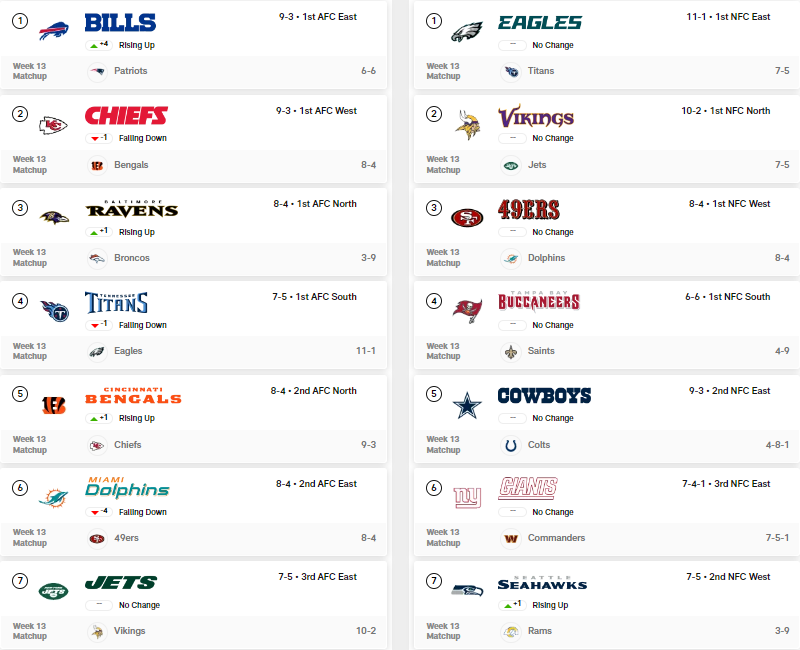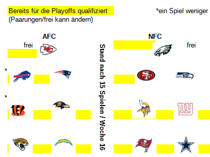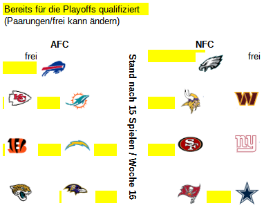 Lesedauer 11 MinutenWie erwähnt sind erst 2 Teams (HOU, CHI) ohne Chance für die Playoffs. Und noch KEIN Team ist sicher in den Playoffs. Es gibt viele Teams, welche aber aus meiner Sicht nicht mehr zu verdrängen sind. Doch nicht einmal die 11-1 Eagles können sicher sein. Bei den Eagles aber geht es um den Platz innerhalb… Woche 14 / 2022 weiterlesen
