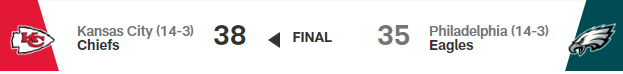 Auf das Spiel gehe ich zu diesem späten Zeitpunkt nicht mehr ein. Es war spannend (zur Pause waren die Chiefs noch 10 Punkte hinten) und aus meiner Sicht der richtige Sieger.