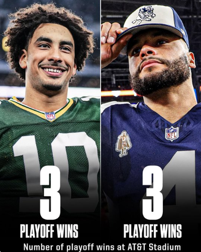 Das Bild ist irreführend: es geht nicht um Love/Prescott sondern darum, dass die Packers seit 2009 gleich viele Playoff-Siege im AT&T Stadium feiern konnten.