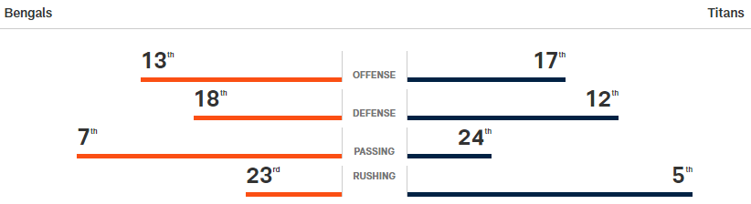 Überraschend für mich haben die Bengals das letzte Aufeinandertreffen 31:20 (am 31.10.2020) gewonnen. Hinzu kommt, dass QB Tannehill in den Playoffs abbaut: ca. 100 Passyards pro Spiel weniger als in der regulären Saison. Vielleicht auch, weil man auf die Läufe von Henry setzt und dies bewusst in Kauf genommen wird.