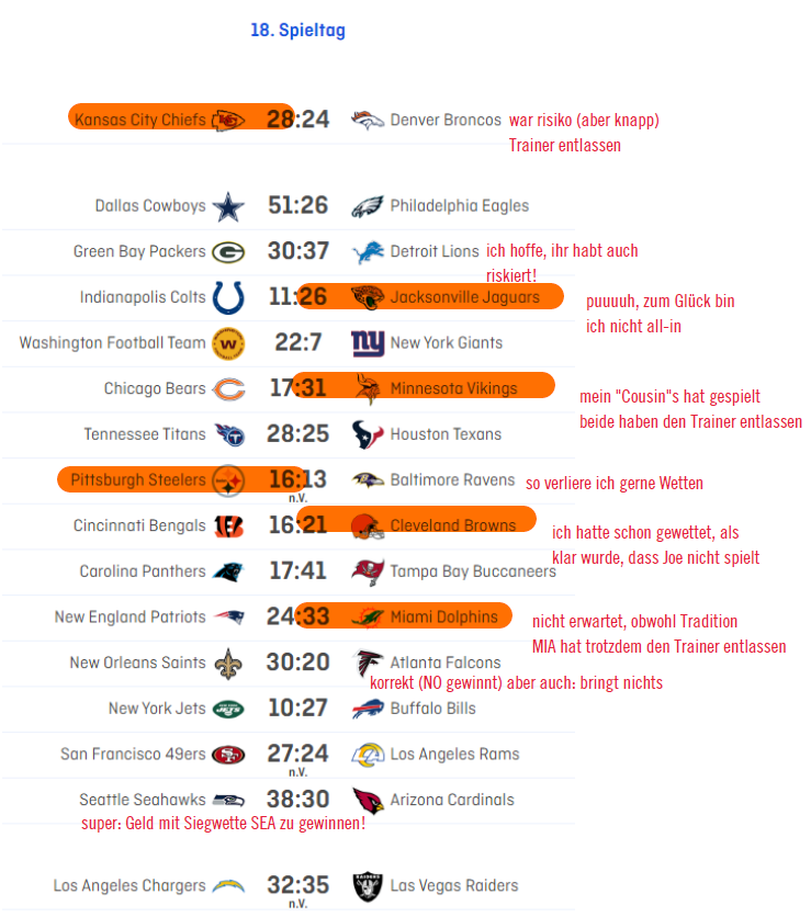 Eine kleine Entscheidung war der Sieg der Seahawks bei den Cardinals. Damit behalten die Rams den Divisionstitel; meine Hoffnung auf SB-Sieg ARI sind wieder gedämpft und dazu muss man sagen: von den 4 NFC West Teams sind LAR, ARI und SF in den Playoffs, nur Seattle (7-10 aber 3 der 6 Divisionsduelle gewonnen) hat es nicht geschafft.
