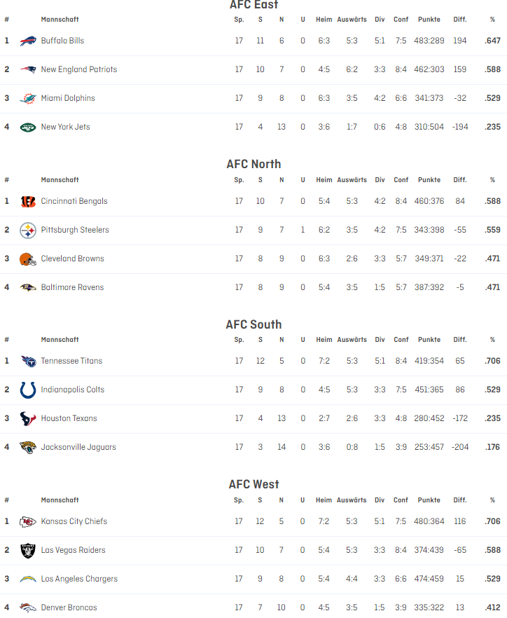 Nur die Broncos belegen ebenfalls mit 7-10 den 4. Divisionsrang. Konnten aber nur 1 der 6 Divisionsduelle gewinnen.
