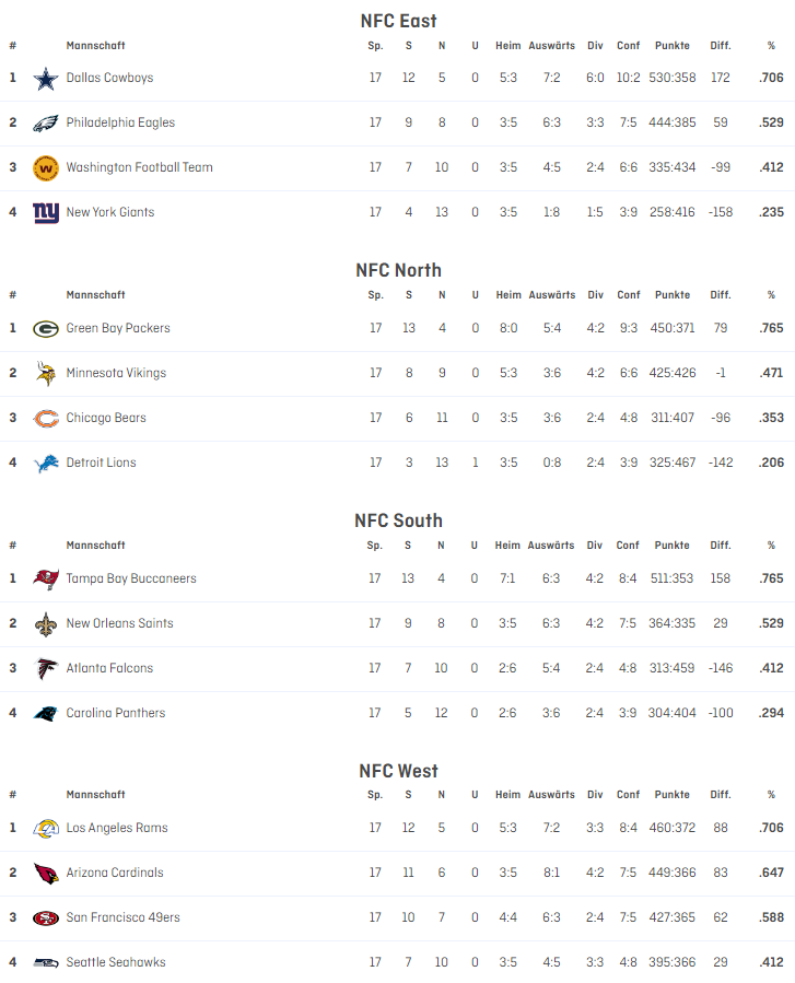 Auch die Entscheidung in der NFC war spannend: SF sollte gegen LAR gewinnen. Denn, wenn NO gegen ATL gewinnt und SF verliert, sind die Saints anstelle der 49ers in den Playoffs.