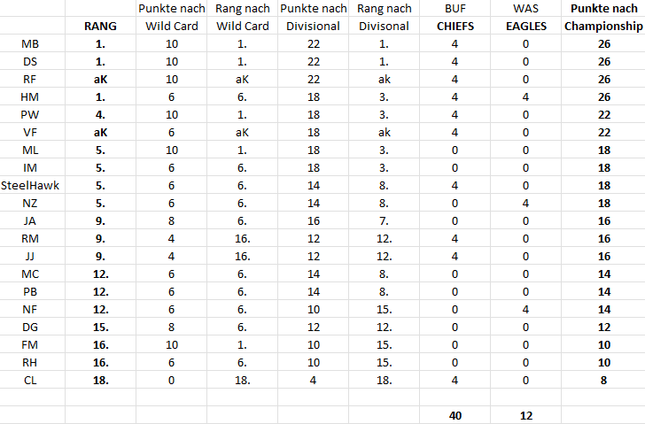 In der Wild Card Round 2024 waren 6 x 2 Punkte möglich (12). In der Divisional Round 2024 waren 4 x 4 Punkte möglich (16). Im Championships 2024 auch 4 x 4 Punkte (16). Pro richtigem Team im Super Bowl LIX sind es je 4 Punkte (8).