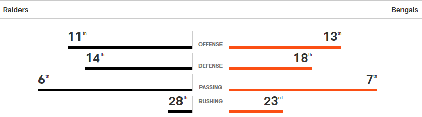 Doch Beide sind für mich überraschend: CIN mit seiner jungen Offensive und dem Beweis, dass Burrow zurecht der #1 Pick war. Die Raiders hingegen das komplettere Team und trotz all den Rückschlägen (HC Gruden weg, tödlicher Autounfall, Morddrohung eines Spielers mit der Waffe, etc) stehen die nun hier. Die Rangierungen der einzelnen Mannschaftsteilen sind ähnlich: