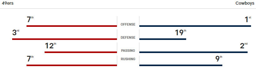Klar: beste Offensive aber die der 49ers ist im Ranking nicht weit zurück und schaut auch die Defensiven an: Rang 3 ist beeindruckend. Aber kurz zum Abstand zwischen der besten O und Rang 7: die Cowboys haben 103 Punkte mehr erzielt und sogar 7 Punkte weniger zugelassen.
