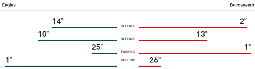 Der Favorit hier ist klar. Nicht nur wegen Brady sondern ein Blick auf die Bilanz zeigt es klar. Doch genau die ist gefährlich: die Eagles können frei „auflaufen“ – genau: die Nummer 1 im Laufspiel und daher nicht zu unterschätzen. Wäre es nur dies, so wären die Eagles nicht in der Postseason aber die haben die Nr 10 Verteidigung.