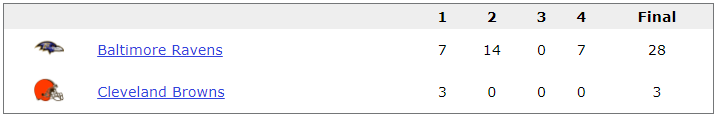 Bei zwei so guten Defensiven ist zu erwarten, dass keine Punkte fallen. Dies lässt jedoch ausser acht, dass die Browns 27 und die Ravens 37 Punkte erzielten.