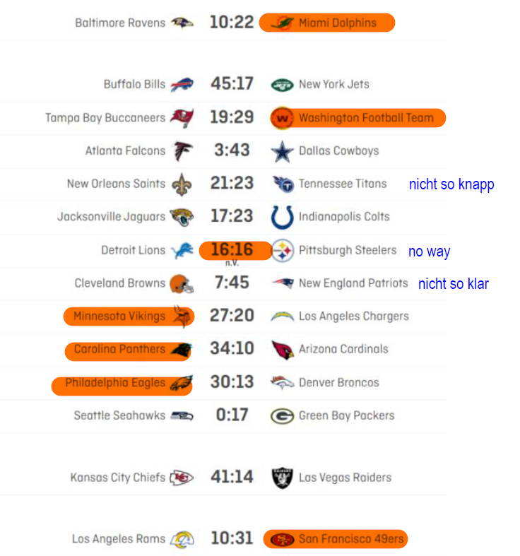 Seattle mit dem selben Rekord, wie CHI oder WAS. Das gefällt mir nicht und die Playoffs habe ich schon früh abgeschrieben. Eigentlich dachte ich, Schuld sei die Defensive. Doch die hat gegen GB einen guten Job gemacht. Doch was passiert mit Arizona? Ja gegen GB darf kann man 21:24 verlieren. Aber doch nicht gegen CAR 10:34. Obwohl Divisionsrivale: mein SuperBowl Tipp (Frühsommer). Watt, Murray und Hopkins verletzt und ohne die ist ARI nicht mehr mein SB-Tipp-Team. 2020 hat jeweils das Heimteam die Begegnung gewonnen; im Jahr davor das Auswärtsteam. Historisch steht es in 45 Spielen seit 1976 23-21 für SEA. Und wenn wir schon bei Geschichte sind: ich sichere mich mit Q1.75 für Sieg (SEA Q2.05) ARI ab. Die gleichen Quoten wie im Divisionsduell MIN vs GB