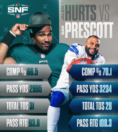 Hurts mit weniger Yards und weniger TD als Prescott – aber prozentual mehr Pässe angebracht.