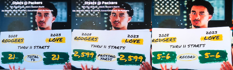 Wir wissen inzwischen, dass Love sein 12. gegen die Chiefs gewonnen hat. Er hat 25 von 36 (69%) für 267 Yds bei 3 TD ohne INT (Rating 118.6).