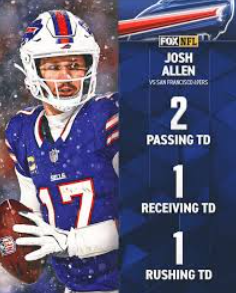 Josh Allen ist der erste (und damit gleichzeitig der einzige) Quarterback, welcher in einem Spiel einen Pass- (sogar 2), einen Receiving- und einen Rushing-Touchdown hat. Weil Jackson und die Ravens schwächeln ist er wieder gut im MVP-Rennen.