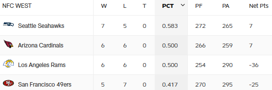 Der Superbowl Teilnehmer aus der letzten Saison, die San Francisco 49ers, ist aktuell letzter in der Division. Natürlich ist alles sehr eng beieinander und der Record (0.417) wird am Ende egal sein -> der erste Platz in der NFC West qualifiziert für die Playoffs.