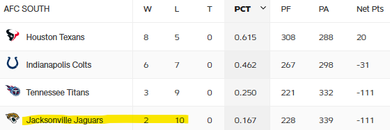 Wieder sehe ich ein Muster und die Tennessee Titans sollten gewinnen. Müssen sie auch: die Jaguars sind bereits raus aus dem Rennen. Die Titans könnten die nächsten sein.