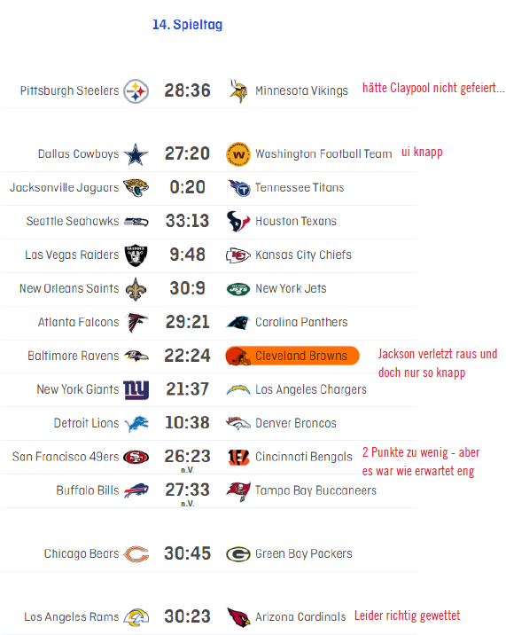 Der 61. Sieg seit 1972 (aktuell steht es 60-40) wird einfach für die Cowboys. Klarer Wettfavorit: 1.2 zu 4.5. Am 10.10.2021 hat DAL bereits 44:12 gewonnen. Der letzte Sieg der Giants in diesem Duell war 2016. Stimmt eigentlich nicht, der letzte Sieg ist noch nicht lange her: 03.01.2021. Auf der einten Seite verstehe ich, dass wenn die Playoffs klar sind, die Starspieler geschont werden. Doch wieso dem Divisionsrivalen den Sieg „schenken“. Und wie am Beispiel der Steelers sichtbar wurde, kann dies auch sehr schädlich sein.