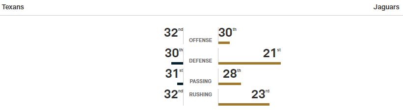 In 39 Spielen seit 2002 steht es 13-26 für Houston; der letzte Jaguars Sieg war 2017. Vorteil HOU.