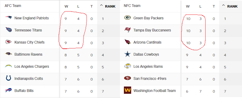 BEIDE NICHT IN DEN PLAYOFFS. Vor der Saison und eigentlich überhaupt wie ich finde zu recht. Aber CIN ist 8. und DEN 9. auf Rang 6 (IND) und 7 (BUF) sind jedoch auch Teams mit 7 Siegen und 6 Niederlagen (einfach die sympathischeren). Wahrscheinlich könnte DEN bei einem Sieg bis Rang 5 (aktuell von den Chargers gehalten) vorstossen. Dies soll verdeutlichen, wie eng die Entscheidungen sind und in den 17 Spielen geht es nur darum, in die Postseason reinzukommen. Danach ist alles (SB Sieg möglich). Klar: je besser klassiert, desto länger geniesst man das Heimrecht. Bestimmt macht es im Conference (1/2 Finale) einen Unterschied, ob Tom mit den Bucs Zuhause (20 Grad) spielen kann oder zB nach Green Bay (Schnee, Minustemperaturen). Hier übrigens gewinnt das Heimteam: Quote 1.6 (zu 2.3)