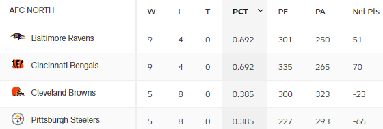 Achtung Spoiler: durch den Sieg der Browns gegen die Ravens führen die Bengals nun die AFC North an. Und die haben keine Quaterback Probleme. Müssen aber nach diesem Spiel noch gegen NE und BUF spielen. Zum Abschluss dann das Re-Match gegen die Ravens.
