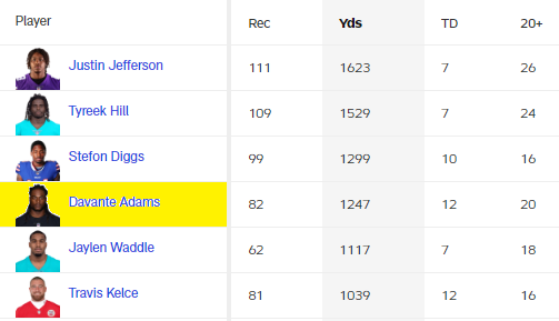 Die ersten 3 haben am Samstag gespielt – wie auch Waddle. (Bewusst habe ich Kelce ebenfalls noch mitgenommen – er ist ein TE und kein WR)