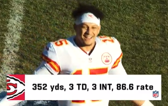Mahomes immer noch im Rennen um den MVP dabei aber er hat ein TD/INT Verhältnis von 3:1. Und letzte Woche gegen die Broncos (zwar 34:28 gewonnen – aber diese Broncos sind nicht gut)