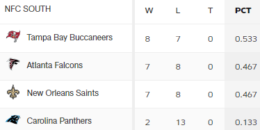 Saints danach gegen ATL und Bucs gegen CAR. Aufgrund der Resultate innerhalb der Division bin ich der Meinung, mit einem Sieg hier, kann den Bucs der Divisionstitel nicht mehr genommen werden.