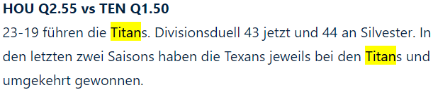 Mit 2 TD Vorsprung gegen die Texans ohne Stroud gewonnen. Doch es war knapp – berücksichtigt man den Punktestand 12 Minuten vor Schluss.