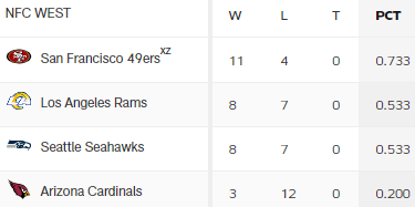 Neunundsechzig Prozent hätte ich vor der Saison genommen. Schade hat man gegen die Rams Zweimal verloren. Aber jetzt zwei überzeugende Siege (als letztes Spiel gegen ARI) und die Playoffs sollten Tatsache sein.