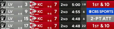 Mahomes in 7 Sekunden mit 2 Touchdowns. Diese Aussage ist korrekt aber im negativen Sinn: Erst verliert er den Ball (Fumble) und er wird von den Raiders zum Pick-Six zurückgetragen und nach dem Kickoff wirft er zum Raider mit gleichem Resultat.