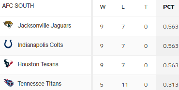 DAS ist ein Finale in der AFC South. Die Texans müssen dieses Spiel (aus meiner Sicht) gewinnen und die Titans in einem letzten Energieanfall gegen die Jaguars. Die stehen in der Division bei 4-1 – HOU und IND bei 3-2.