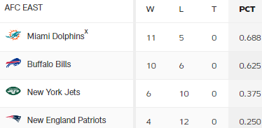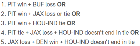 Logisch mit einem Sieg gewinnt BUF die Division – ein Unentschieden sichert die Playoffs. Genauso eine Niederlage der Steelers oder Jaguars.
