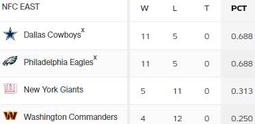 Aktuell hält man den kleinstmöglichsten Titel: Divisionssieger. Doch nur bei einem Sieg oder gleichzeitige Niederlage der Eagles gegen NYG ist der sicher.