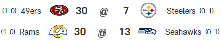 Genau diese zwei Mannschaften haben mir den Saisonauftakt vermiest. Von den 49ers war es nicht anders zu erwarten. Zählen nicht nur bei mir zu den Favoriten. Doch hätte ich mir gewünscht, dass Pittsburgh länger und besser mithalten können.