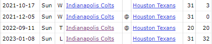 44. Divisionsduell steht an. Klar führen die Colts 32-10-1. Schaut auch die spannenden Resultate der letzten 2 Saisons an:
