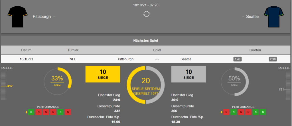 Genau die gleichen Quoten, wie oben – doch da ist ein Team 4-1 und nicht wie hier beide erst mit einem Sieg. Aber es hat sich nun bestätigt: HOU ist dieses Jahr nichts. Aber war ja absehbar mit dieser Personalpolitik. Und da gibt es nichts zu deuteln: IND kann sich verbessern. Seit 2002 und 39 Spielen steht es 30-9 für die Colts. Letzter Sieg HOU: Nov 2019.