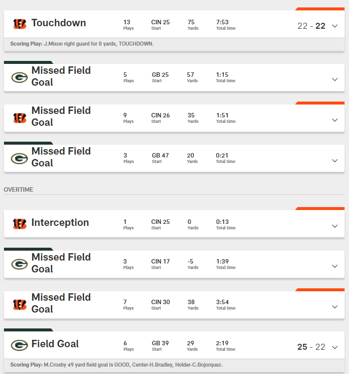 Doch was war da bei CIN vs GB los? B E I D E hätten das Spiel mehrmals entscheiden können. Das war eine Orgie an verpassten Fieldgoals (CIN mit einem Rookie – aber GB mit Crosby (14/15 Jahre in der NFL – 37 Jahre alt). So waren die letzten 2min 12sek und die Verlängerung ein Nervenkrimi.