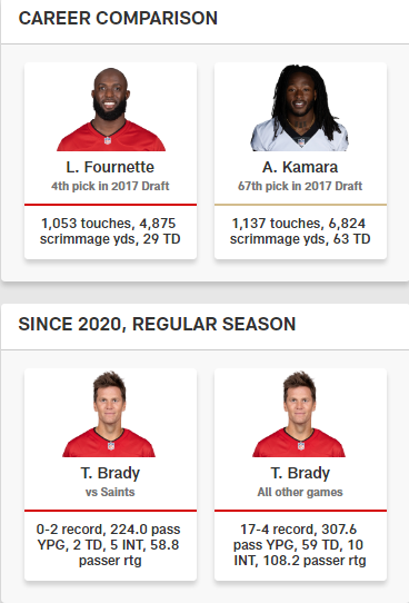 Nun führt TB die Liga mit Anzahl PassYards an. Und in dieser Begegnung trifft die Nr 1 O auf die an Nr 3 rangierte D der Saints. Mit der Offensive der Saints ist es nicht weither: Zweitletzter. Trotz Kamara ist der Lauf nur minim besser, als von Tampa.