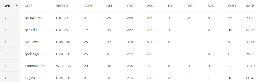 Die Bears haben zwar gegen NE klar gewonnen und ich wünsche Justin Fields den Durchbruch aber der war nicht dabei: 13 von 21, 179 Yds, 1 TD, 1 INT. Hinzu kommen 82 Laufyards und 1 Lauf-TD. Das ergibt nur ein Rating von 85.2. Zwar sein 3. bester Saisonwert aber das sind keine guten Zahlen.