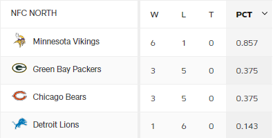 Die Käseköpfe mit 4 Niederlagen in Serie. Das ist sehr ungewohnt. Genau so wie -28 Punktedefizit. Aber ein Blick auf die Tabelle der NFC North zeigt das ganze Ausmass: